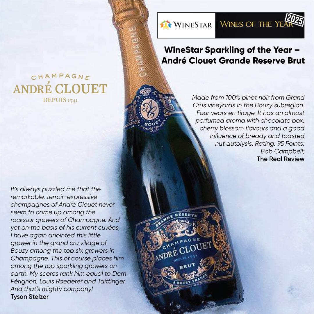 It's always puzzled me that the remarkable, terroir-expressive champagnes of André Clouet never seem to come up among the rockstar growers of Champagne. And yet on the basis of his current cuvées, I have again anointed this liBle grower in the grand cru village of Bouzy among the top six growers in Champagne. This of course places him among the top sparkling growers on earth. My scores rank him equal to Dom Pérignon, Louis Roederer and Taittinger. And that's mighty company! Tyson Stelzer